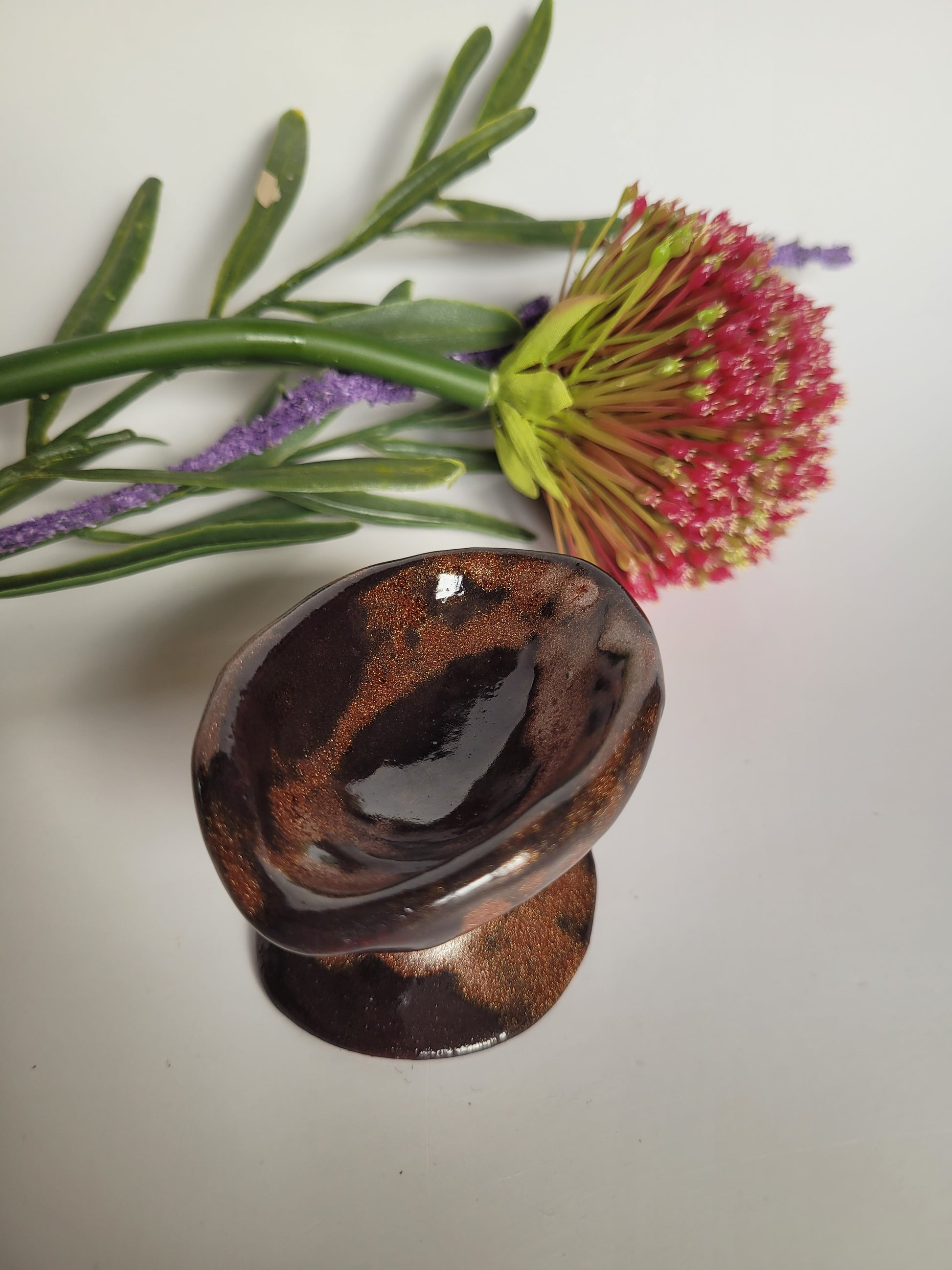 Die Glasur legt sich wie ein schimmernder Abendhimmel darüber, dunkel und doch voller feiner Kupferfunken.