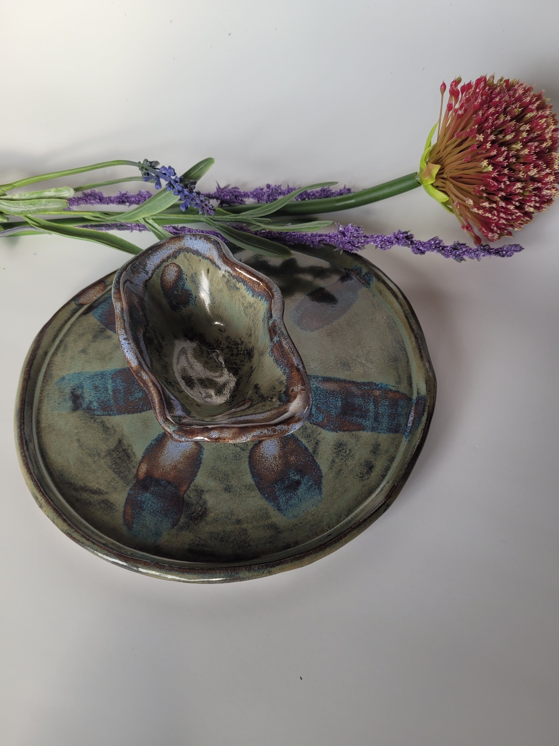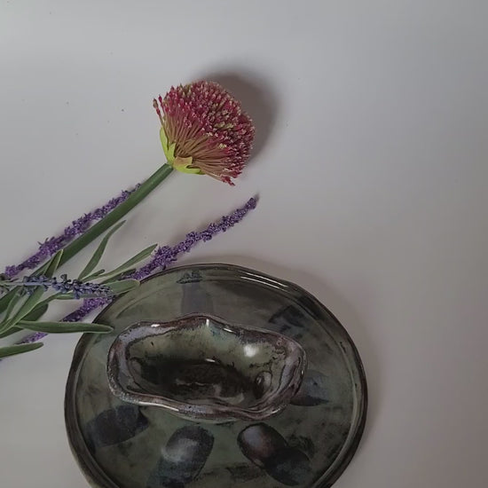 Dieser handgefertigte Teller mit Dipschale vereint rustikalen Charme mit künstlerischer Glasur.